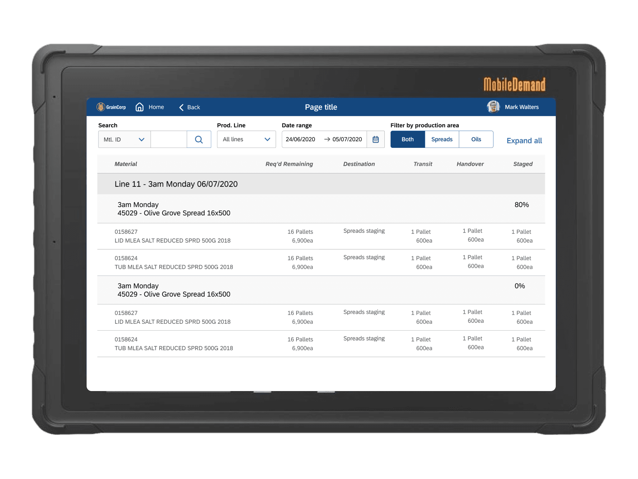 COVID-19 restrictions required remote research and virtual walkthroughs. The goal was to improve speed and accuracy in handling stock (margarines & oils) via handheld devices and forklift-mounted tablet
